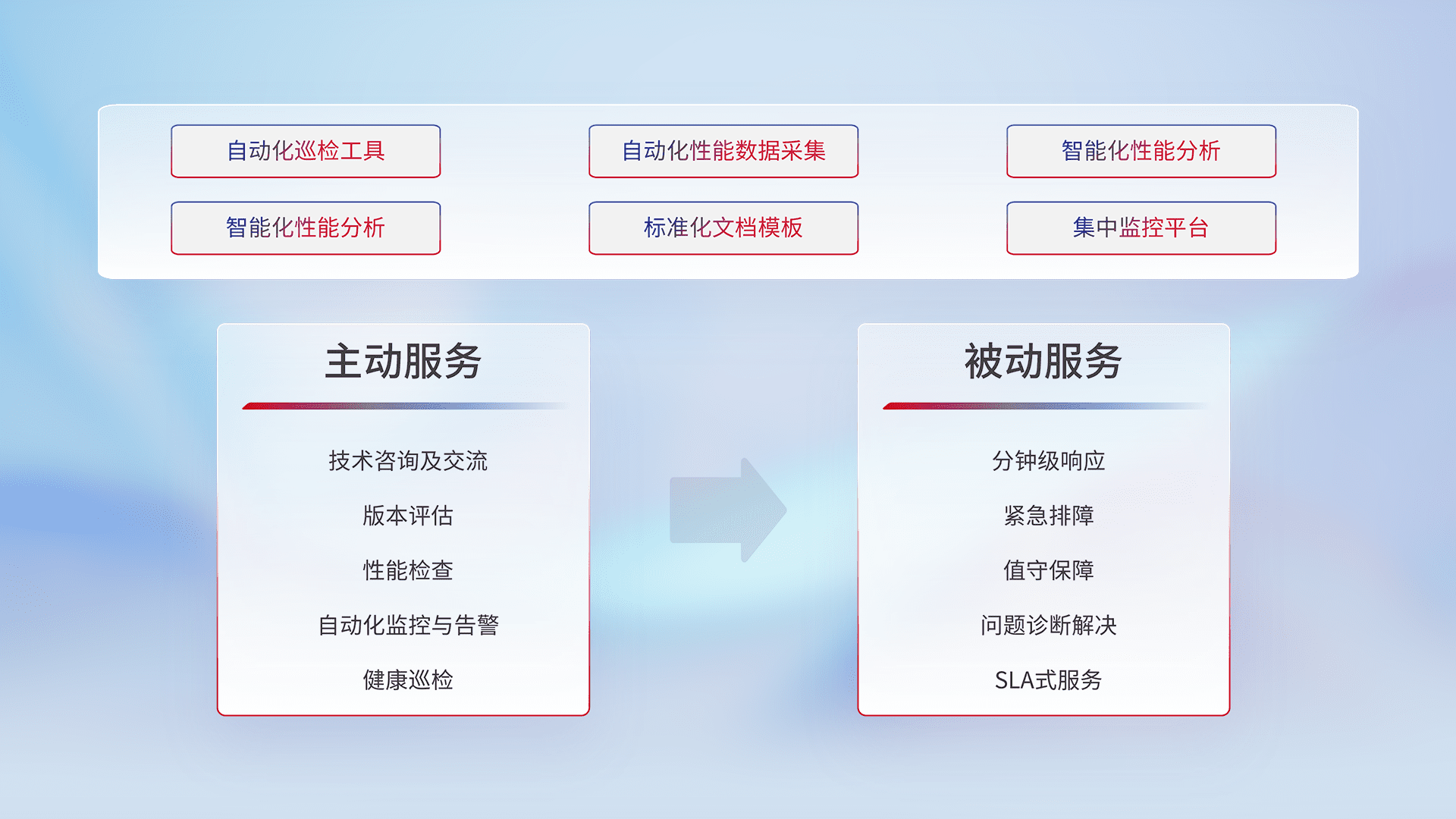 智能化工具和标准化文档,,,保障服务质量,,,,提供主动服务(包含技术咨询、、、版本评估、、、性能检查、、、、自动化监控与告警、、健康巡检)和被动服务包含(分钟级响应、、紧急排障、、值守保障、、、问题诊断解决、、SLA服务)。。。。